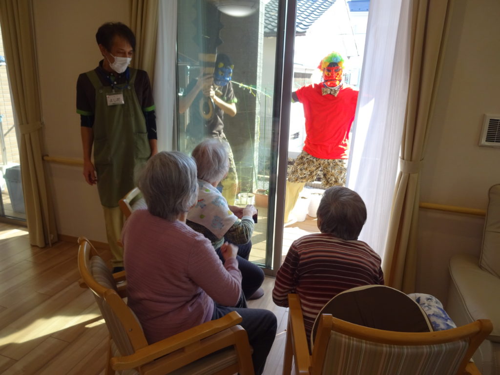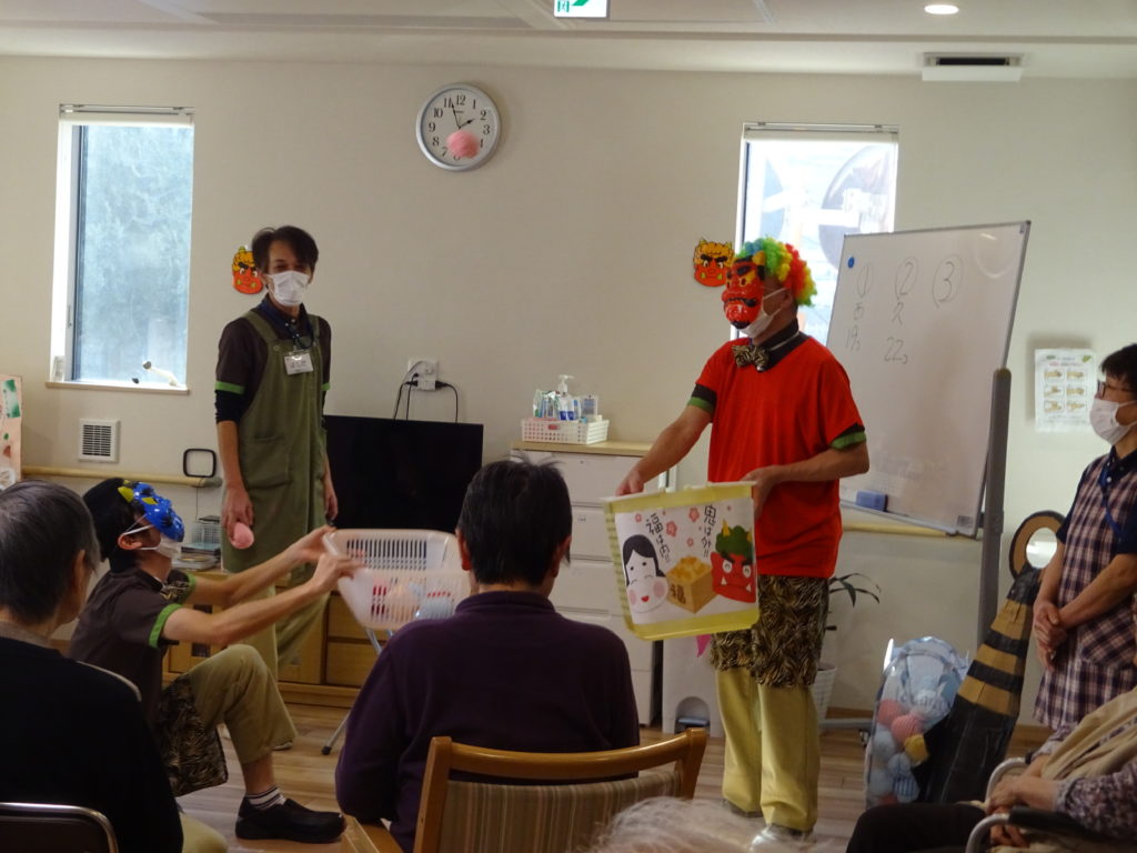 入居者の皆さんも職員が扮した「鬼」に豆をぶつけ鬼退治をし、今年一年の幸福を呼び込みました(^^)/
