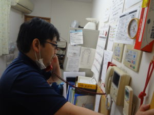 今回、8名の入居者様にもご協力いただき、それぞれ居室内で臥床して頂き、玄関駐車場まで避難誘導が終わるまで約6分。計12分かかりました。