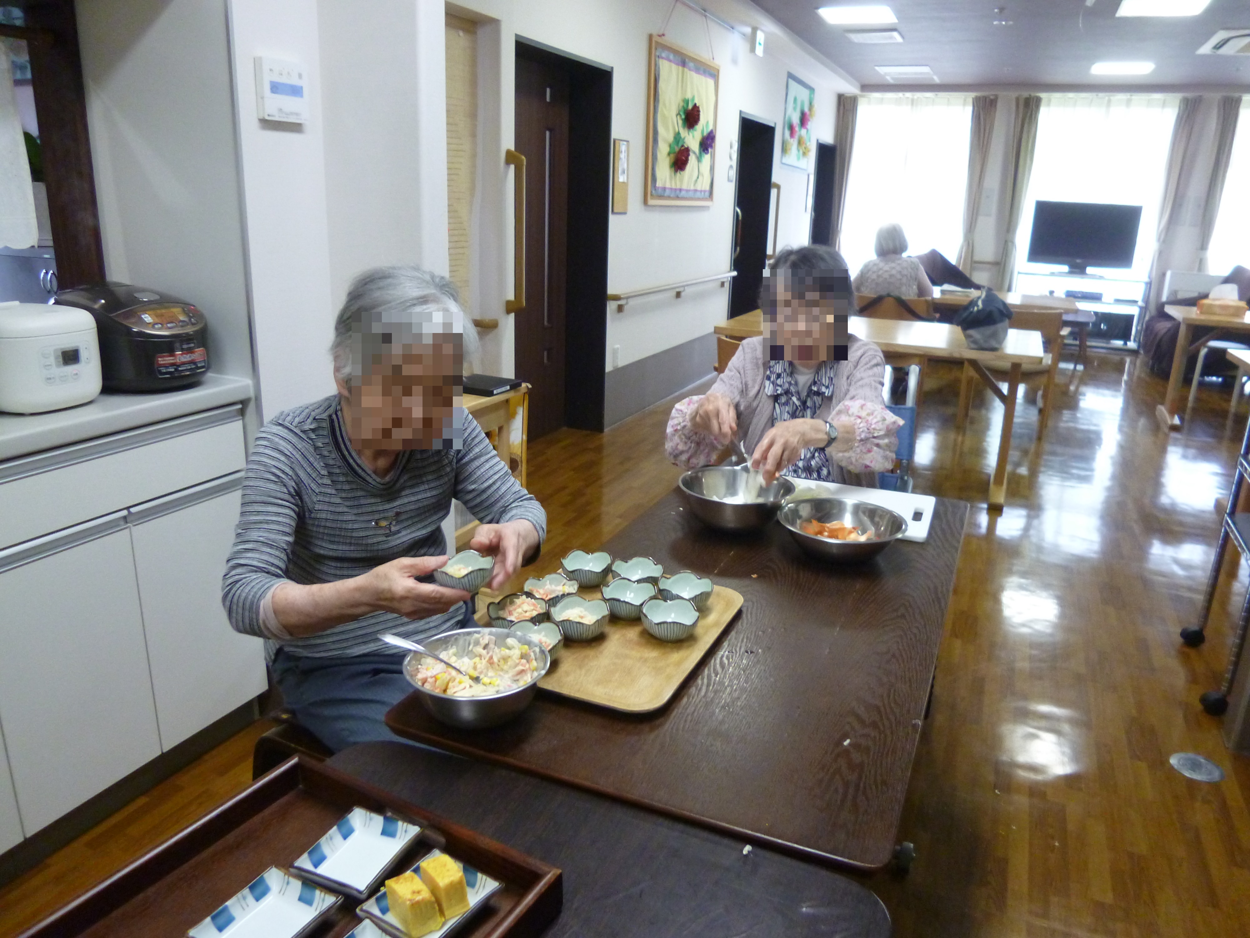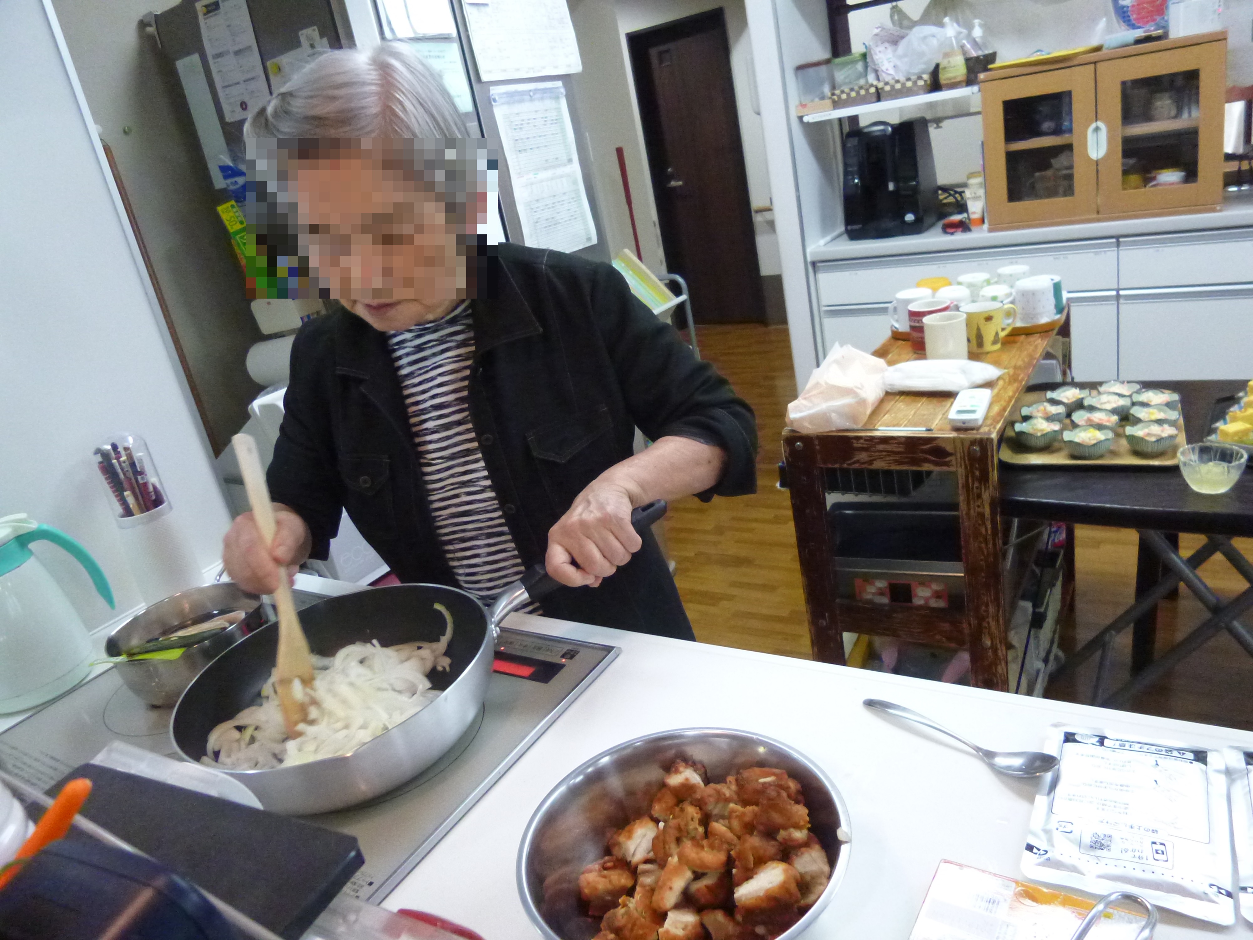 シリーズ グループホームの日常⑪ 投稿日 2018-09-10 ブログカテゴリー carna(カルナ)国立 こんにちは、carna国立です。 今日は、ある日の食事作りの風景です。 基本はスタッフが調理を行いますが、 グループホームの特徴として、入居者様もできることは 自宅で暮らしていた時と同じようにしていただく、 というケアの考えがあります。 (調理だけではなく、掃除や洗濯などもそうですね) この日も職員が見守りながら、それぞれ役割分担して 入居者様が食事作りに励んでくださいました。 できるところまで頑張っていただいてたりします。