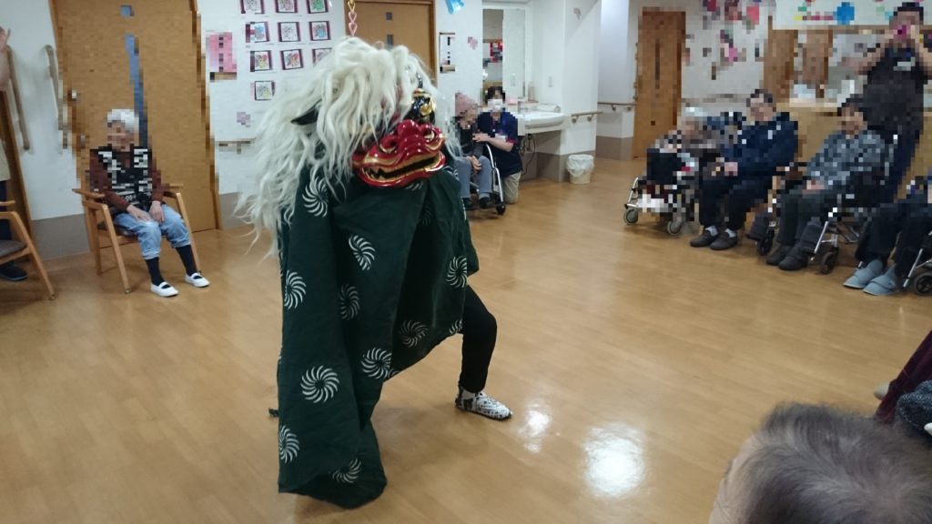 利用者様の近くまで獅子が接近してくださり、利用者様も大変喜ばれていました。