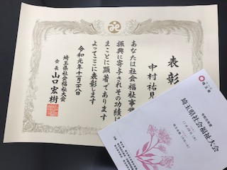 ✨表彰状✨:本社スタッフ 投稿日 2019-12-05 ブログカテゴリー 本社スタッフ こんにちは 本社スタッフです🙃 11月の終わりに埼玉県社会福祉大会があり、 永年勤続者の表彰式が埼玉会館にて行われました。 弊社からは3名の職員が表彰されました✨ おめでとうございます!!