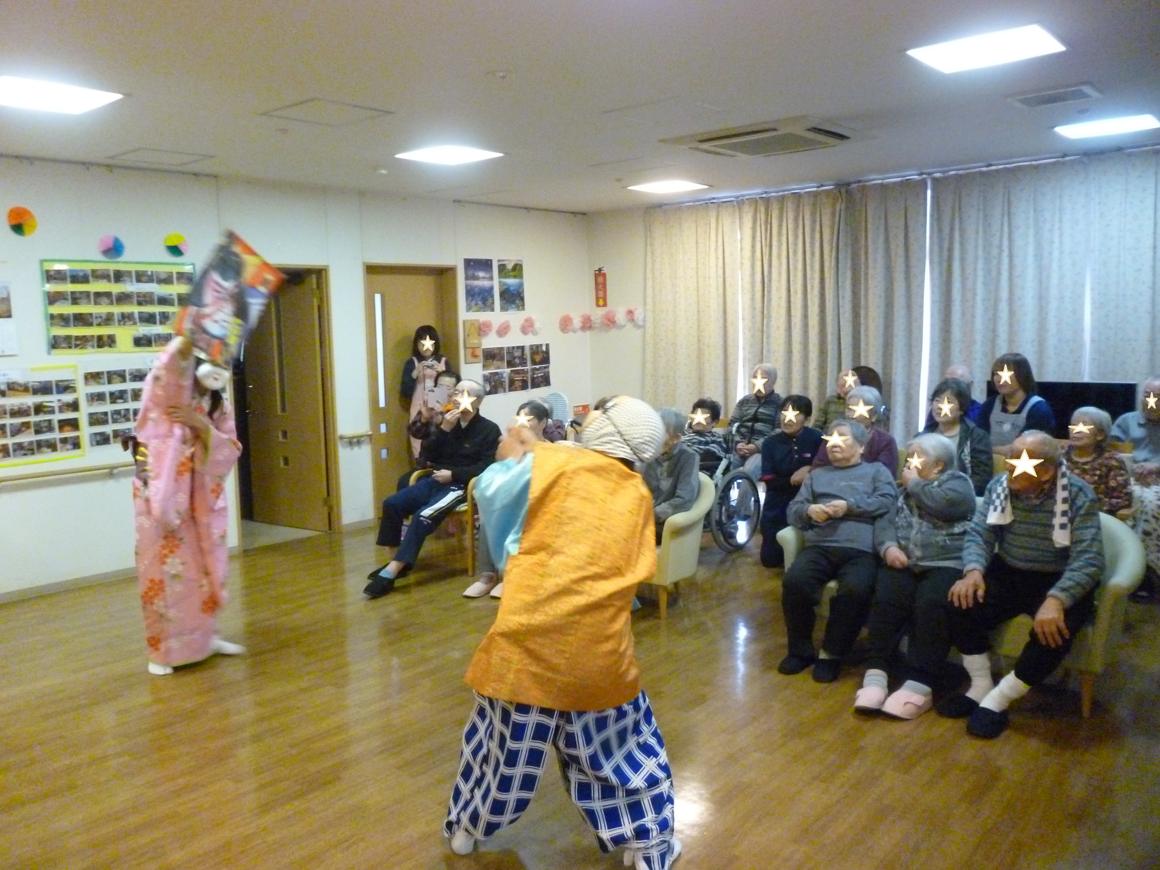 コミカルなひょっとことおかめ、迫力の獅子舞!
