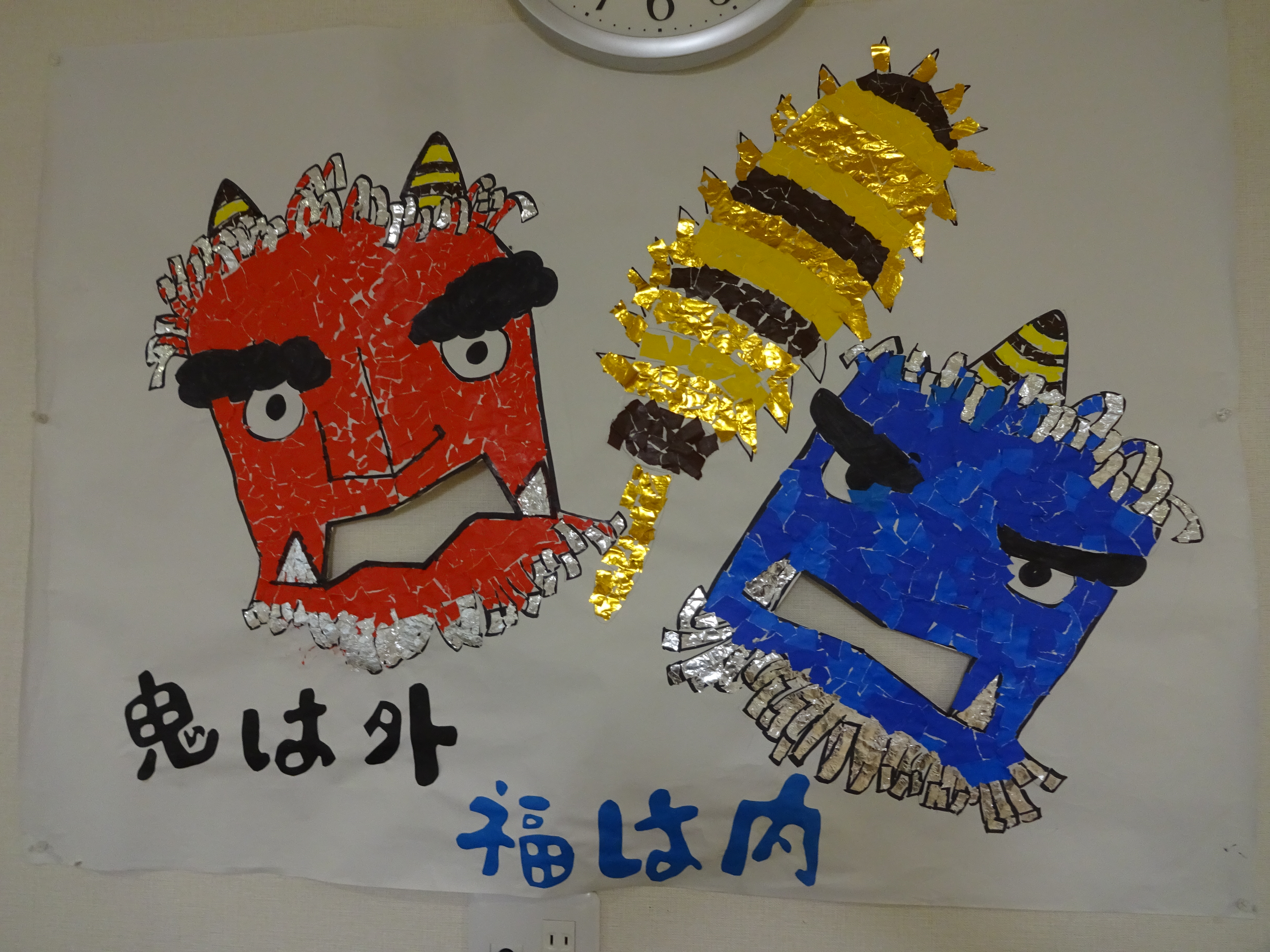 👹節分:戸田 投稿日 2020-02-02 ブログカテゴリー ふれあい多居夢 戸田 2月3日は節分ですね。 ふれあい多居夢戸田では1月中旬頃から赤鬼と青鬼の壁面装飾の製作を始めました。 どんな赤鬼と青鬼が現れるのか楽しみにしていましたが、先日完成しました。 豆まきのしがいがある怖~い鬼が現れました。 季節の変わり目には邪気(鬼)が生じると考えられており、 それを追い払うための行事が節分だそうです。 今年は誰が鬼をやるのかな?? スタッフ
