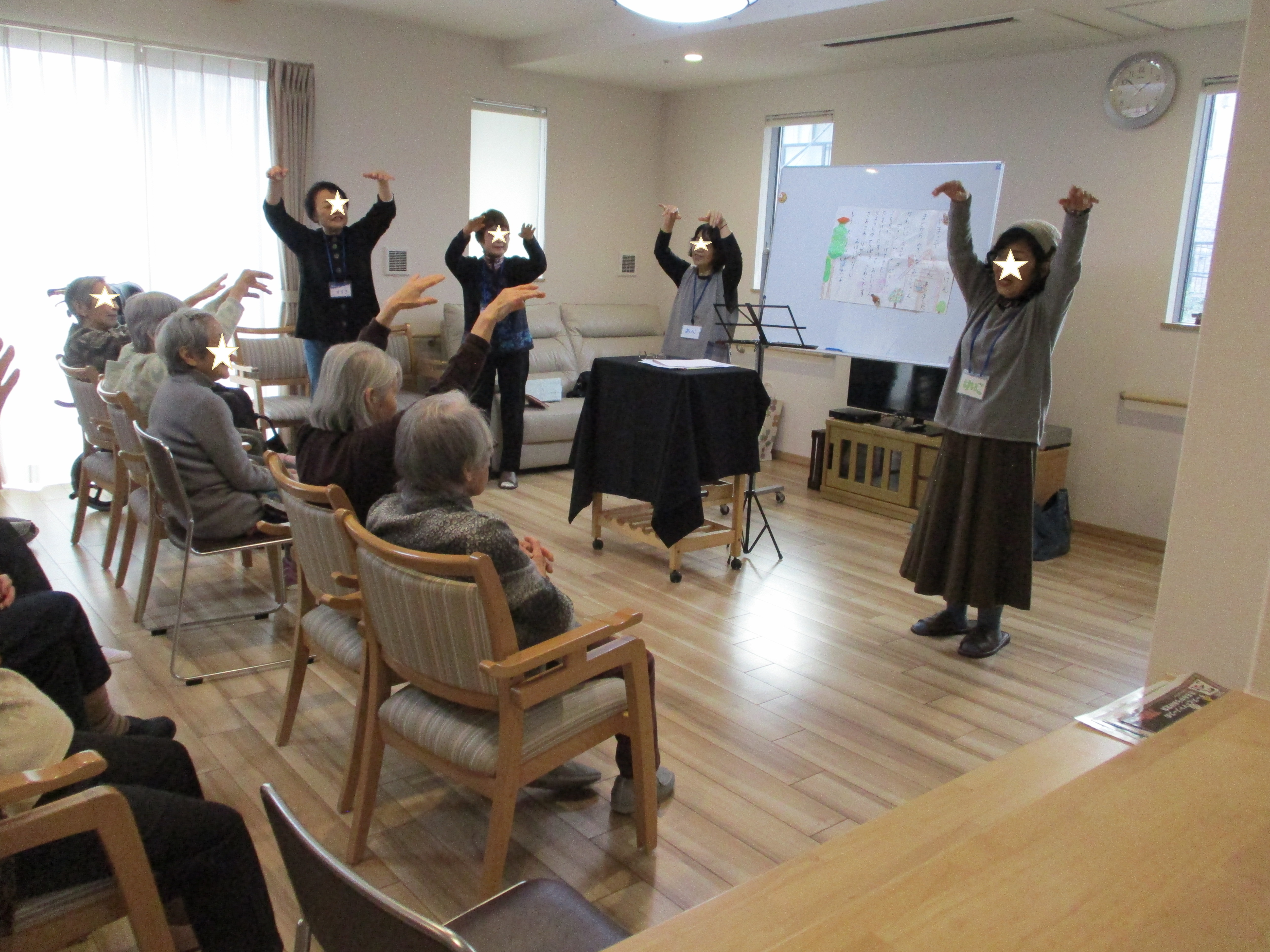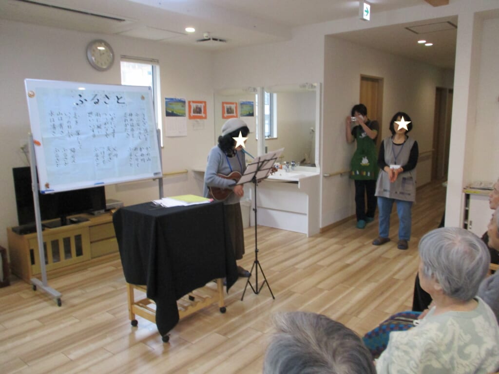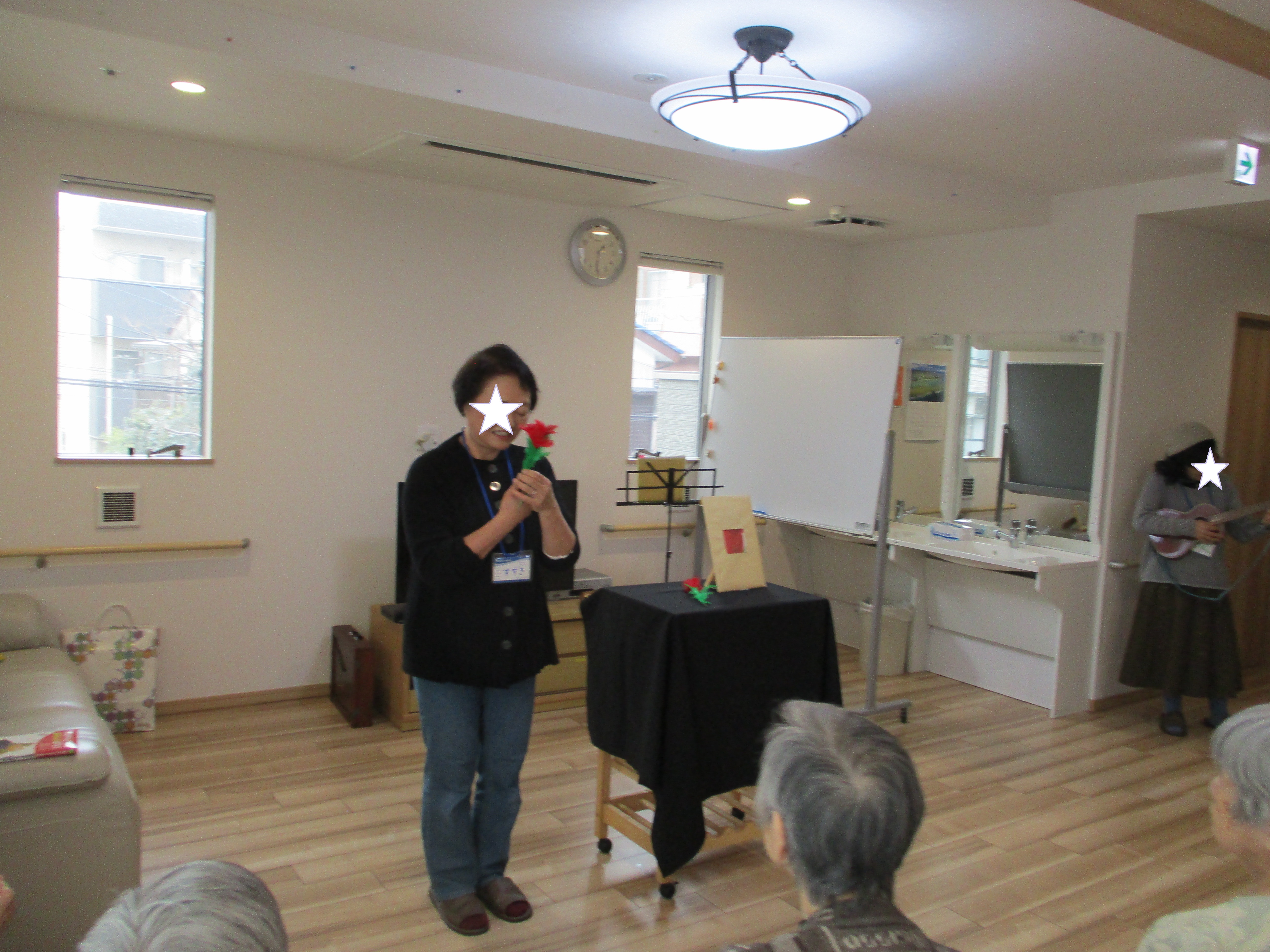 手遊び:戸田 投稿日 2020-02-10 ブログカテゴリー ふれあい多居夢 戸田 ふれあい多居夢戸田です(*’▽’) ボランティアサークル『ローズマリー』の皆さんによる 手遊びレクリエーションが開催されました。 紙芝居や手品、簡単な体操にウクレレ演奏と盛りだくさんでした。 入居者様の笑い声が施設に響くのが一番嬉しいですね(*‘∀‘) スタッフ