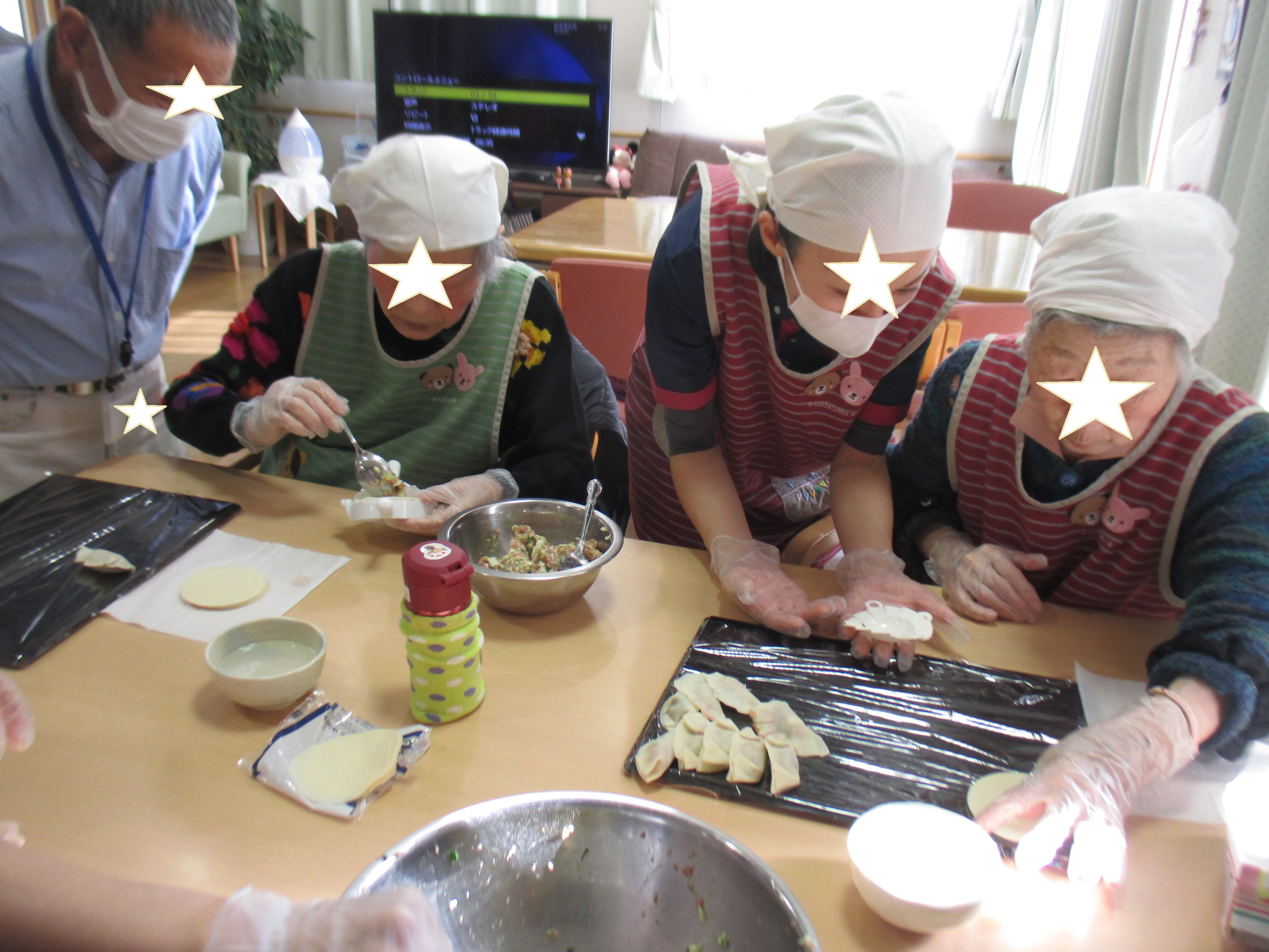 餃子パーティ:希 投稿日 2020-03-06 ブログカテゴリー ふれあい多居夢 希(川越) ふれあい多居夢 希です。 「餃子パーティー🥟」と銘打って、 初めての餃子作りにチャレンジしました。 女性ご利用者は包丁を持つと目の色が変わります。 一から作り、野菜を切っていただいたり、 男性のご利用者にも皮の包みをお願いしました。 手が不自由だったり、「包む」ことがわからない 方はスタッフと一緒に「餃子包み機」 (100円ショップの物)で行いました。 皆様たくさん召し上がりました! スタッフ