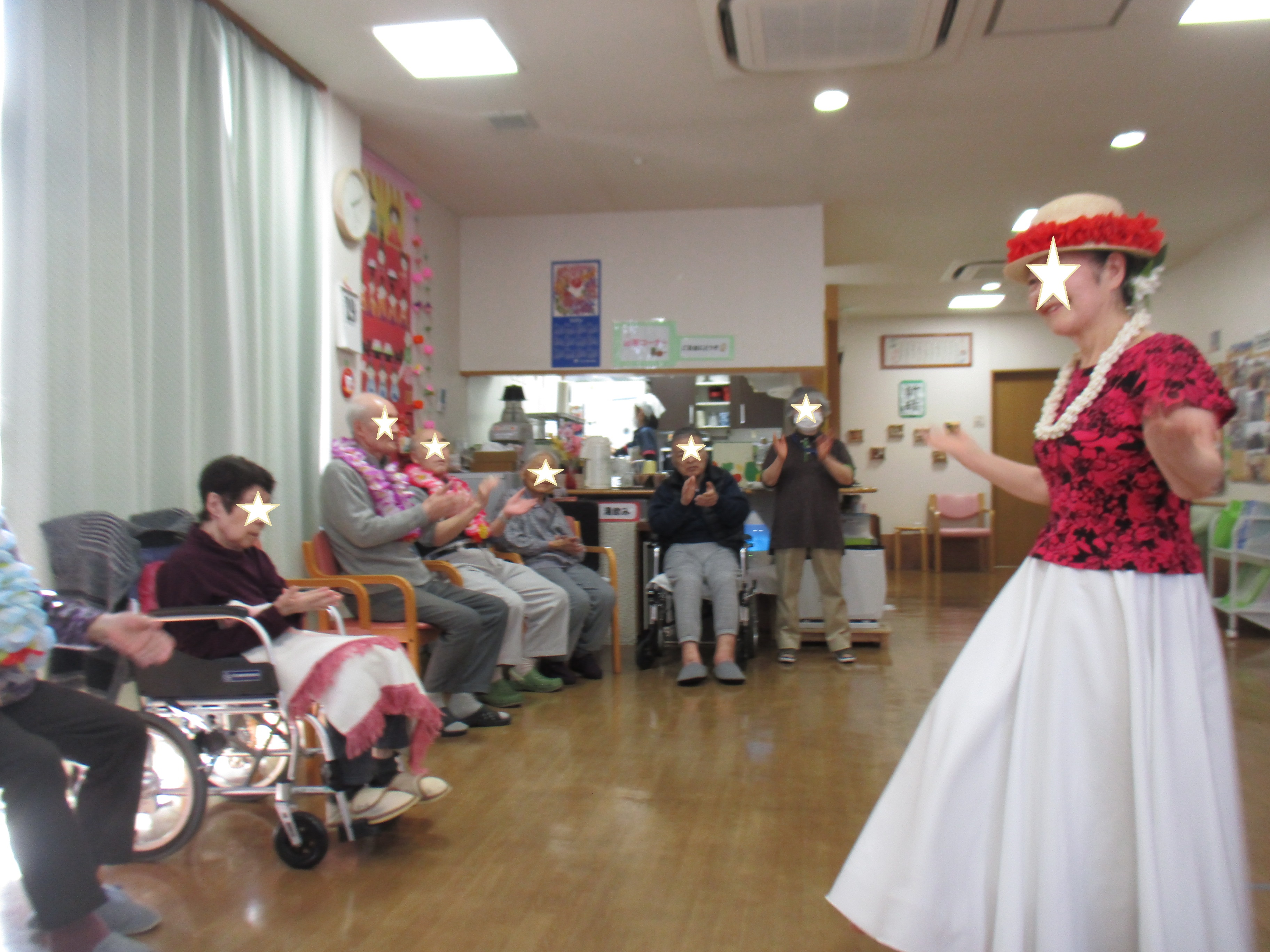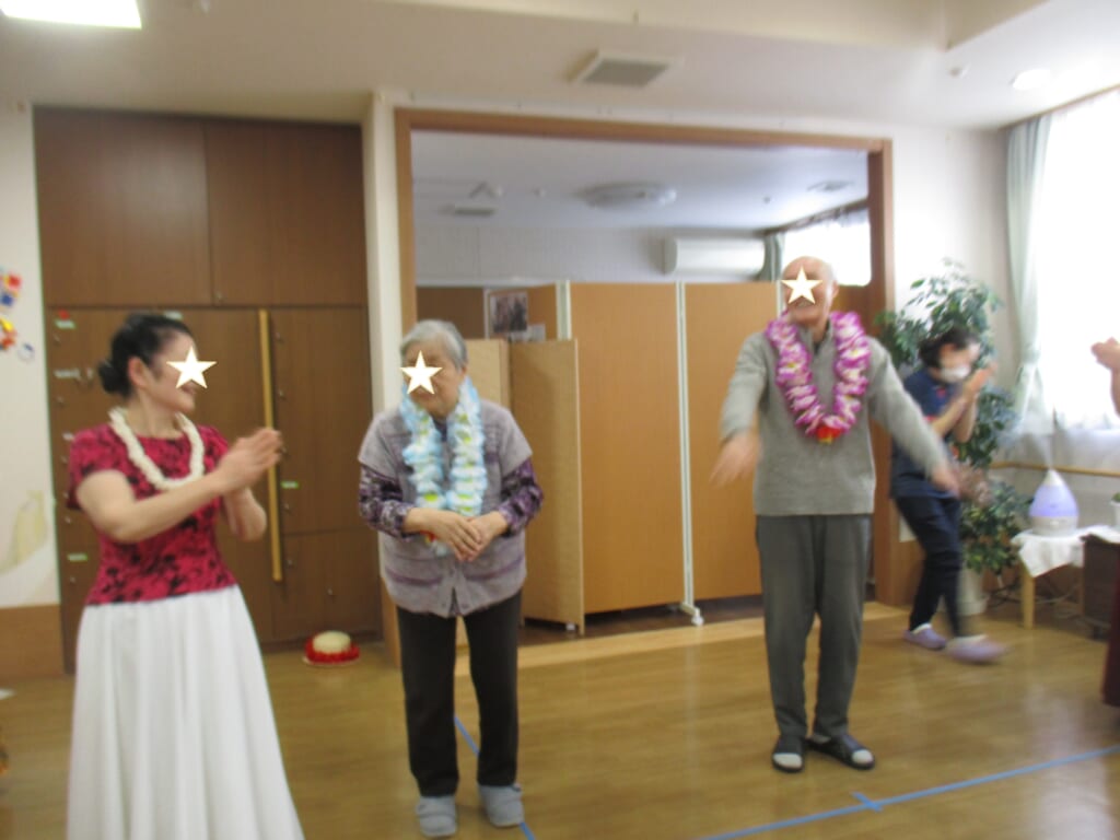 誕生日会~フラダンスボランティア~:希 投稿日 2020-03-10 ブログカテゴリー ふれあい多居夢 希(川越) ふれあい多居夢 希です。 2月の誕生日会です! フラダンスのボランティアの方々にお願いしました。 皆さんと一緒に踊ったり、ダンサーの方々を目で追い 手を動かして自然と踊っているご利用者の皆様など、とても印象的でした。 賑やかしいフラではなく、しっとりと大人のフラ演目で ご利用者やスタッフからもとても好評でした。 スタッフ