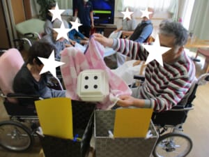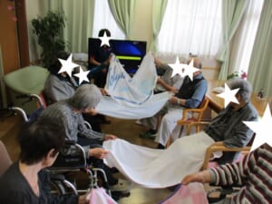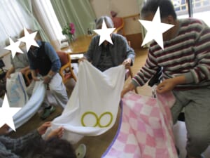 モノ送りゲーム:希 投稿日 2020-06-03 ブログカテゴリー ふれあい多居夢 希(川越) 5月吉日、みなさんで集まって「モノ送りゲーム」を行いました。 二人ずつペアで協力し合い、 お隣のペアにいろいろな「モノ」を送っていきます。 一緒に大きなバスタオルを操作します。 気持ちが通じ合うと笑顔になりますね ( *´艸`)