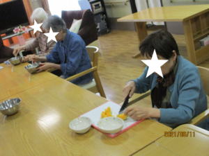 果物を切ったり、混ぜたり、盛り分けたりと、