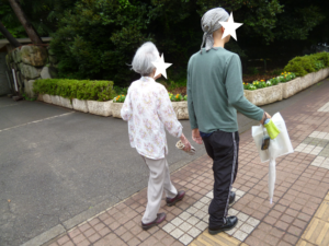 入居者様と「白十字」でお茶をしている写真が。
