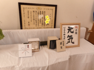 敬老会👨🦳👩🦳川口峯 投稿日 2021-11-05 ブログカテゴリー ふれあい多居夢 川口峯 やはりコロナ真っ最中ということで、 今年は昨年よりも小規模に行いました。 いつもより少し豪華な昼食後に、 ご入居者様のご紹介をして、プレゼント🎁と、 🔴紅白饅頭◯をお渡ししました♪ 早く以前のように、ご家族様と一緒に 盛大にお祝いがしたいです・・・。 けれど今年も、皆さまの笑顔が見られて 本当によかったです♪ ٩(ˊᗜˋ*)و 以前も紹介した、今年100歳のご入居者様ですが お誕生日には市よりお祝いをいただき、 敬老の日に合わせ国よりお祝いいただきました。 菅総理・・・レアです(笑)