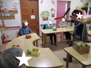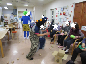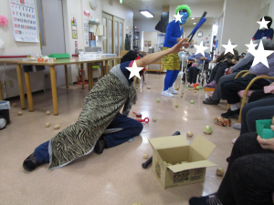*浦和の節分( * > 投稿日 2022-02-09 ブログカテゴリー ふれあい多居夢 浦和 2月3日、今年も豆まきで厄払いをしました。 赤鬼、青鬼にご入居者様が豆まきをします。👹👹 浦和は豆の代わりに、ご入居者様が 新聞紙を丸めて作ってくださった玉を投げます。 「鬼はそと~😊 福はうち~😊」 大きな声が響きます。 浦和のやさしい鬼たちは、見た目は怖いのですが 投げた後の豆代わりの玉を拾っては ご入居者様に渡してくれたり、 ご入居者様を脅かしながらも ときどき優しさが垣間見れます。 「鬼も福もうち~😊」 浦和は、鬼も味方にしたようです。( ᐢ˙꒳˙ᐢ )