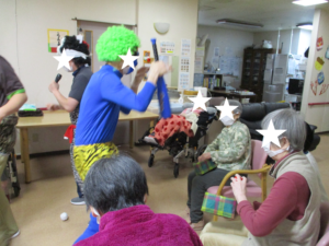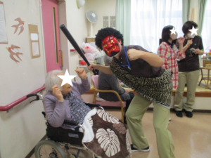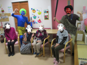 ふれあい多居夢浦和👹節分! 投稿日 2023-02-13 ブログカテゴリー ふれあい多居夢 浦和 ふれあい多居夢浦和です!٩( ‘ω’ )و 今年も鬼に豆まきをし、厄払いをしました。 でんでん太鼓の音が鳴り響き、 ふれあい多居夢浦和にも鬼がやってきました。 赤鬼、青鬼が、大暴れです。 ご入居者様は、新聞を丸めて作成した豆を 張り切って鬼に投げます! 「おには~そと!」 「ふくは~うち!」 「鬼こわい~」というご入居者様も、 思いっきり豆を投げてくださるご入居者様も、 様々なご入居者様がいらっしゃいました。 ただ皆さん共通するのは、笑顔! しっかりと節分を楽しむことができました♪
