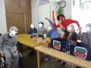 👹鬼は~外!💥ふれあい多居夢希 投稿日 2024-03-04 ブログカテゴリー ふれあい多居夢 希(川越) ふれあい多居夢希です♪ 節分レクでは、まめまきを行いました。 新聞を丸めた豆をカゴに入れて鬼を退治したり 鬼と一緒に豆まきをしたり!? と、 楽しい時間を過ごされていました。 今年も、笑いで厄を払いました!