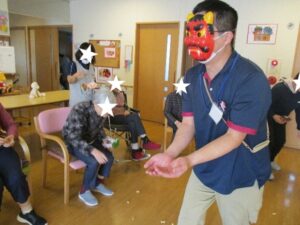 スタッフが赤鬼に扮して豆まきを行いました!