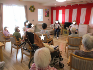 ふれあい多居夢戸田の近況📢 投稿日 2024-09-22 ブログカテゴリー ふれあい多居夢 戸田 皆様こんにちは! ふれあい多居夢戸田です。 熱波からひと段落・・・ と思いきや、また暑さが復活しておりませんか? さすがに9月下旬、連日の暑さは堪えます。 そのため、近所への散歩も なかなか実施できないでいます。🥵 そんな中、入居者様同士で別フロアを探索し、 おしゃべり等していただいてお過ごしです。✨ 敬老会は、1階・2階合同で実施しました! 美人……? 姉妹のギター演奏とともに、 みなさんで一緒に懐メロを唄い、 楽しいひとときでした🎸