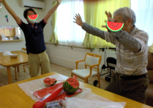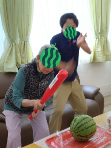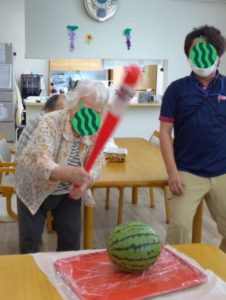 すいか割り🍉✨多居夢志木宗岡 投稿日 2025-07-24 ブログカテゴリー ふれあい多居夢志木宗岡 こんにちは! ふれあい多居夢志木宗岡です(*゚▽゚)ノ 全国的に梅雨が明け酷暑が続いており、 いよいよ夏本番・・・ですが、先日は施設内にて すいか割り大会が行われました!🍉🍉🍉 みなさま真剣な表情で、 我こそはと割る気満々です。 力強くバットを振り下ろし・・・。 なかなか割れません! 最後は男性の力で見事に割っていただき、 赤い果実を目にすることができました♪ そして、みんなでおいしくいただきました。
